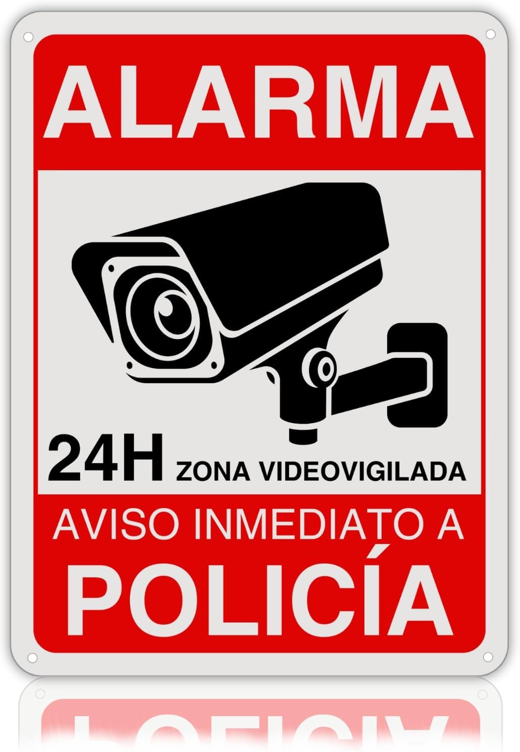 con icono de cámara, texto «ALARMA» y «POLICÍA», que mide 21 cm de ancho por 28 cm de alto. Indica videovigilancia las 24 horas con notificación inmediata a la policíacon icono de cámara, texto «ALARMA» y «POLICÍA», que mide 21 cm de ancho por 28 cm de alto. Indica videovigilancia las 24 horas con notificación inmediata a la policía