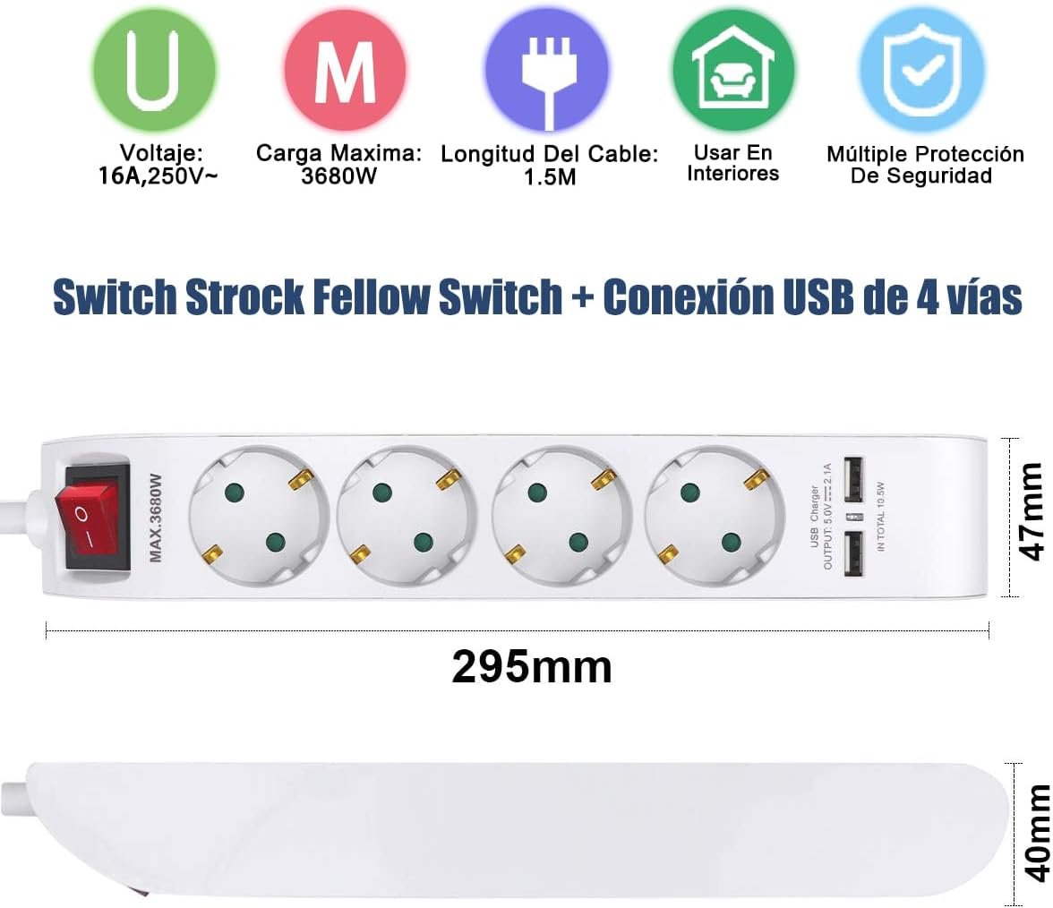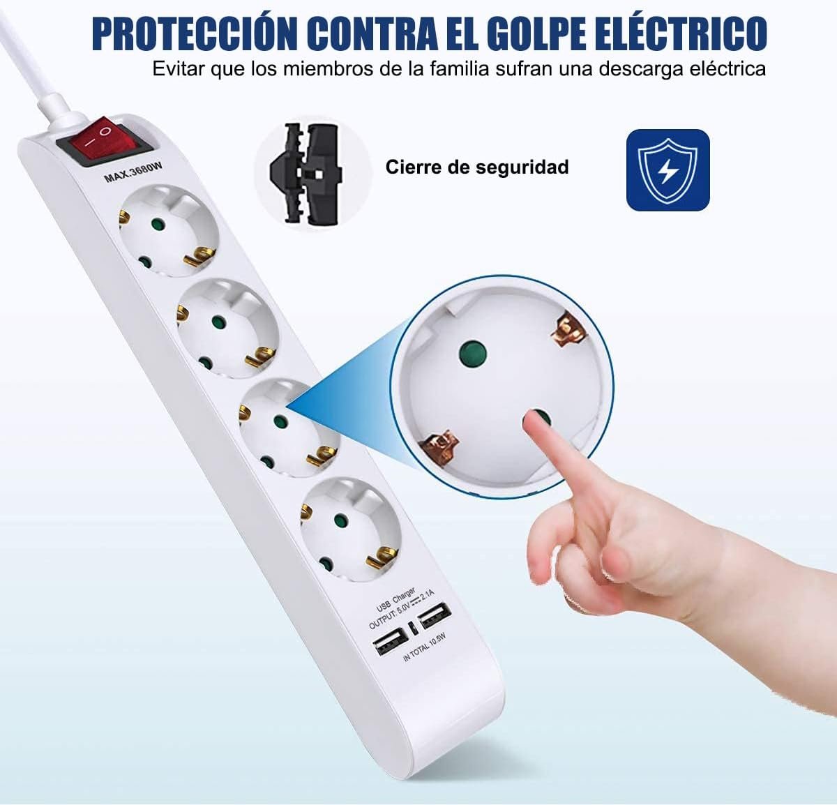 4 tomas de corriente + 2 puertos USB (5 V/2,4 A): cargue hasta 6 dispositivos simultáneamente (4 tomas estándar + 2 USB), ideal para teléfonos inteligentes, tabletas, portátiles y pequeños electrodomésticos.