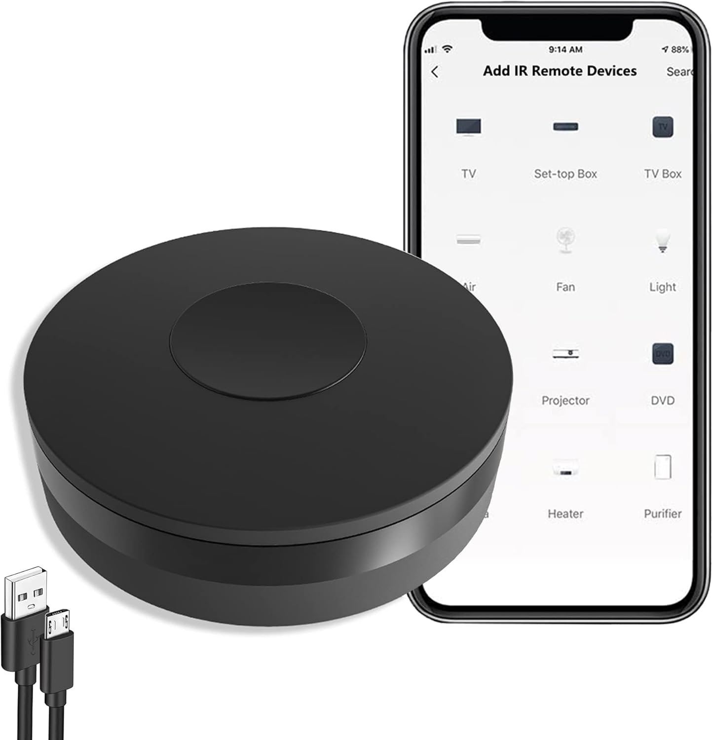 Administra tus dispositivos controlados por IR (38 KHz) a través de tu teléfono móvil, tu teléfono ahora es tu potente control remoto. Con la integración todo en uno, puede controlar parejas de electrodomésticos de forma remota en cualquier lugar y en cualquier momento. (Solo Wi-Fi rojo de 2,4 GHz, no para 5,0 GHz)