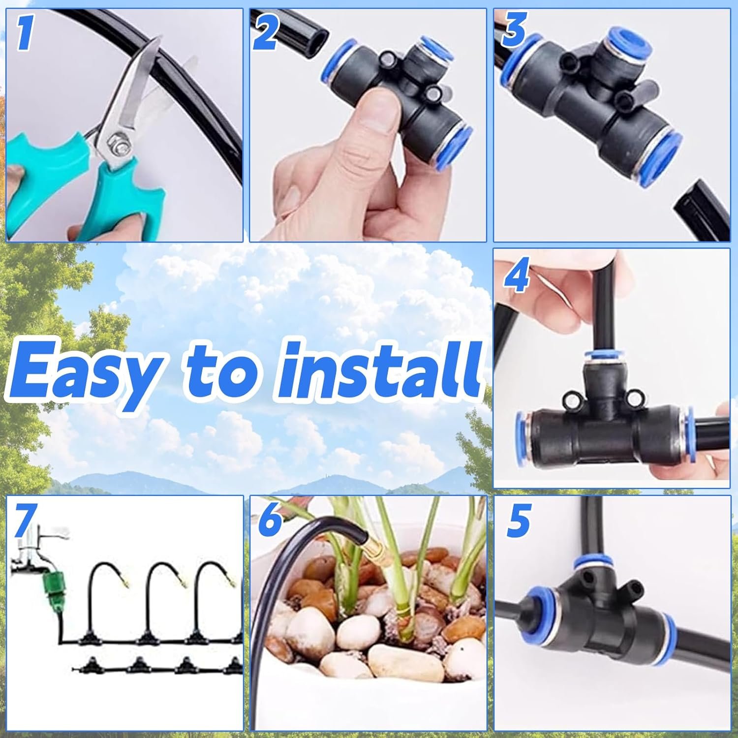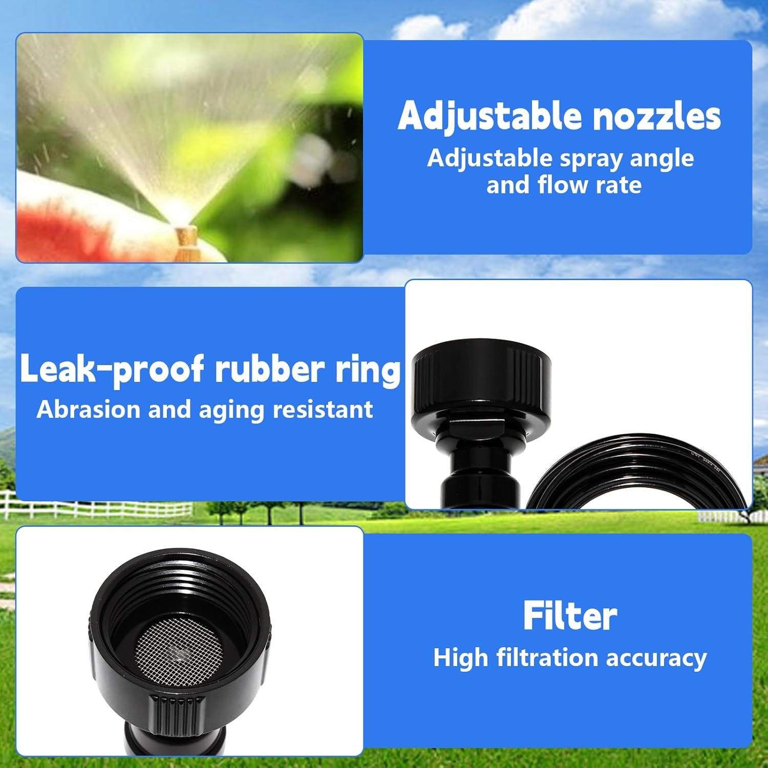 FÁCIL INSTALACIÓN: Diseñado para una instalación sin complicaciones, nuestro sistema de riego por aspersión utiliza tecnología neumática de conexión rápida. Nuevo conector rápido, manguera de riego plug-and-play, resistente a caídas y fugas.