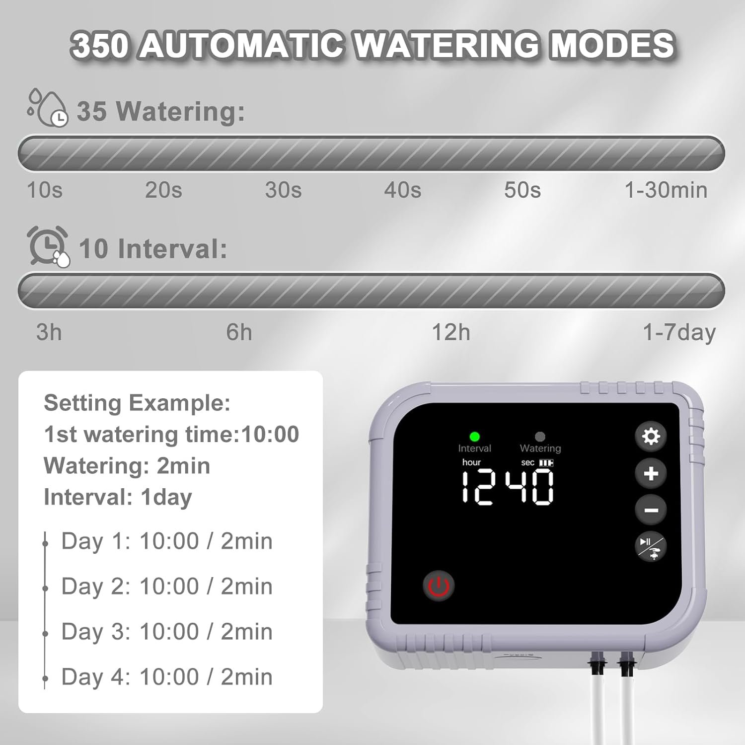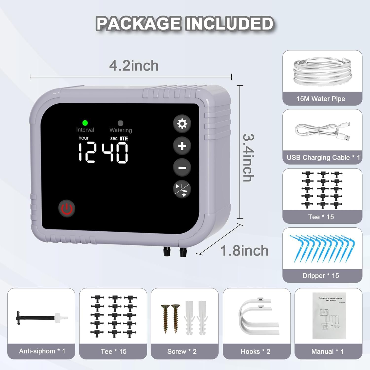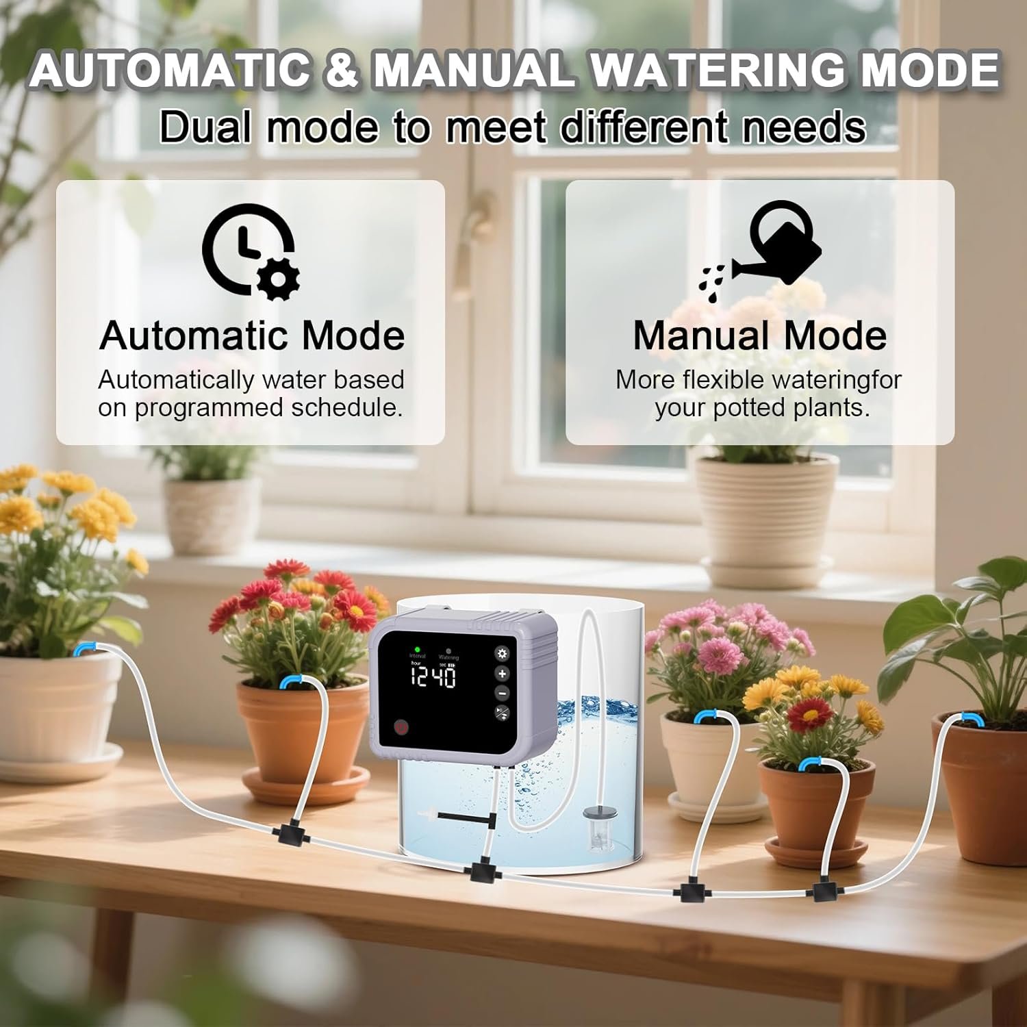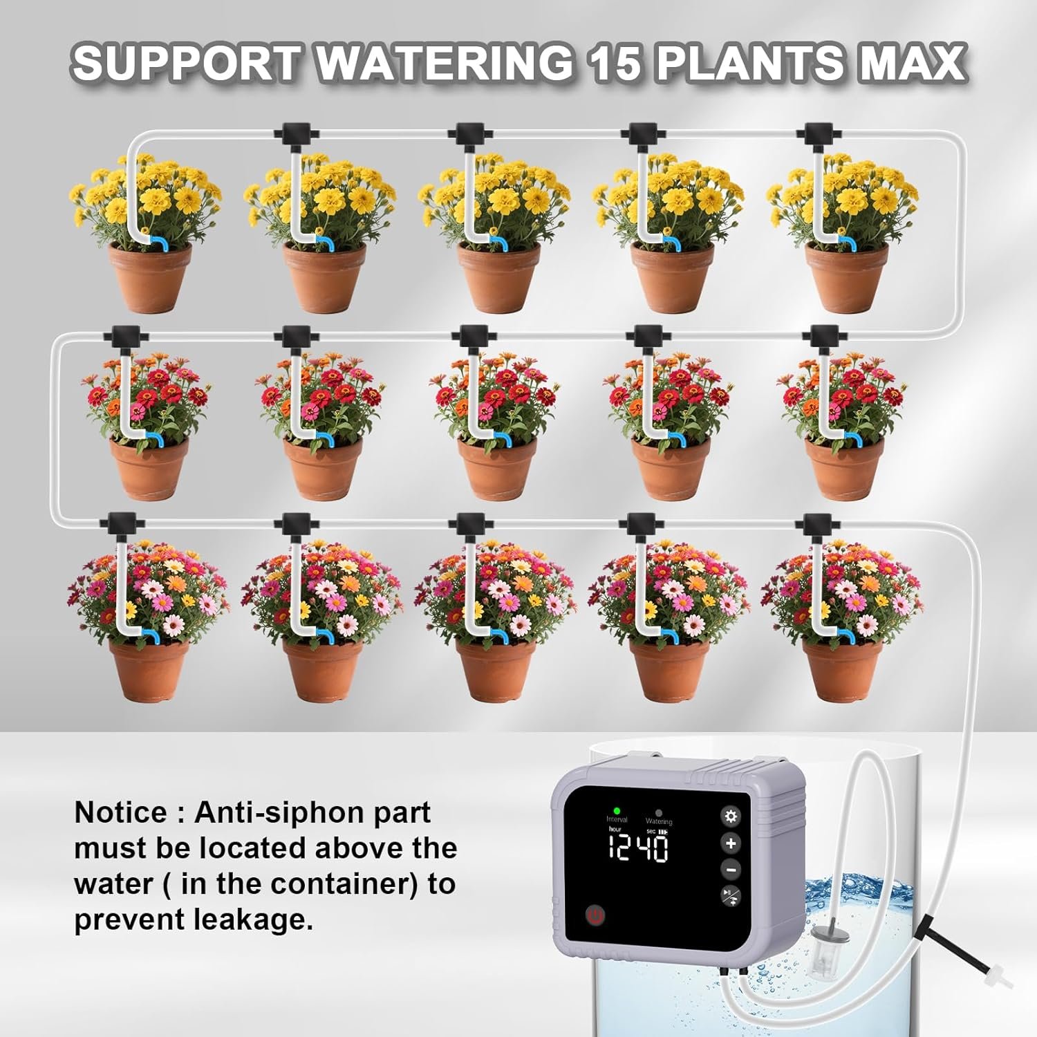 1 pieza Pilas : Se necesitan pilas. (incluido) Dimensiones del producto : 10,5 x 5,5 x 8,5 cm; 670 gramos Fecha de primera disponibilidad : 17 de junio de 2025 Número de modelo del producto : BSV-IC020S Macetas de riego automático: las macetas de jardín con riego automático YAHAMOO están equipadas con un temporizador de bomba de agua independiente con batería incorporada de 2200 mAh para garantizar un riego confiable para sus plantas, ya sea que esté soleado o nublado. La batería de gran capacidad puede funcionar hasta 90 días. El sistema de riego automático de jardín puede regar 15 macetas. RIEGO INCLUSO: a diferencia de otros, el sistema de riego YAHAMOO utiliza una bomba más potente para garantizar un riego uniforme de hasta 15 plantas en macetas. Adecuado para riego de césped, terraza, jardín, riego de vegetales, cestas colgantes, plantas en macetas, macizos de flores, invernaderos, etc. Para un mejor crecimiento de las plantas, riegue lenta y uniformemente.