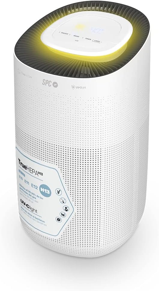 Habitaciones grandes – Purificador de aire inteligente especialmente indicado para habitaciones con una superficie de hasta 145 m². Tiene una alta capacidad de depuración de 400 m3/h e incluye un anillo luminoso que indicará con diferentes colores si la calidad del aire es óptima o no. Todo con un funcionamiento ultrasilencioso de 32 dB. Luz Ultravioleta – Incluye en su interior una luz ultravioleta UV-C, totalmente segura e invisible al ojo humano, que expone y purifica el ADN de organismos como virus, hongos o gérmenes para una limpieza completa. Filtro True Hepa 13: este purificador de aire con filtro HEPA de alta eficiencia que elimina hasta el 99,95% de las partículas nocivas y filtra las más pequeñas como polen, bacterias, ácaros u otros alérgenos. Filtrado de 4 fases – Para una limpieza completa del aire ambiente, cuenta con un sistema de filtración de 4 fases con prefiltro, filtro True HEPA 13, carbón activado que absorbe y elimina los malos olores y la luz ultravioleta. Compatible con Asistentes de Voz – Muy fácil y cómodo de usar, es compatible con Alexa y Google Assistant, y también se puede gestionar desde tu smartphone a través de la aplicación SPC IoT. Además, para mayor comodidad, incorpora Modo Noche, función Child Lock, temporizador y diferentes modos de uso. Se puede transportar fácilmente por cualquier habitación gracias a su asa.