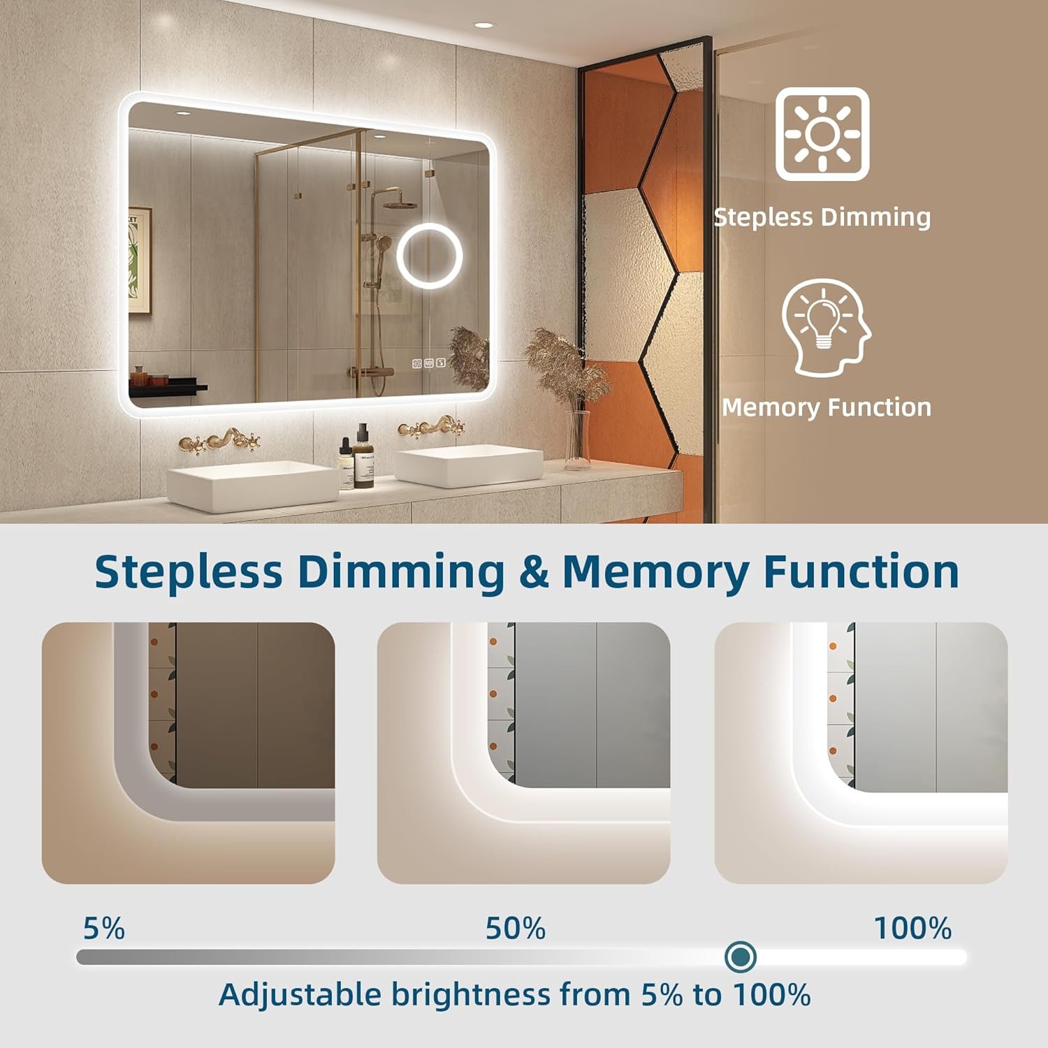 ✨【Cambio de color, atenuación, memoria】-El espejo de baño con luz STARLEAD tiene una variedad de configuraciones de luz que se pueden controlar fácilmente mediante botones táctiles sensibles. Haga doble clic en el botón «luz» para cambiar el color de la luz: blanco (6000K), neutro (4500K), cálido (3000K), mantenga presionado el botón «luz» para ajustar el brillo a un nivel cómodo (100%~5%). Este espejo iluminado tiene función de memoria para mantener la última configuración de luz.