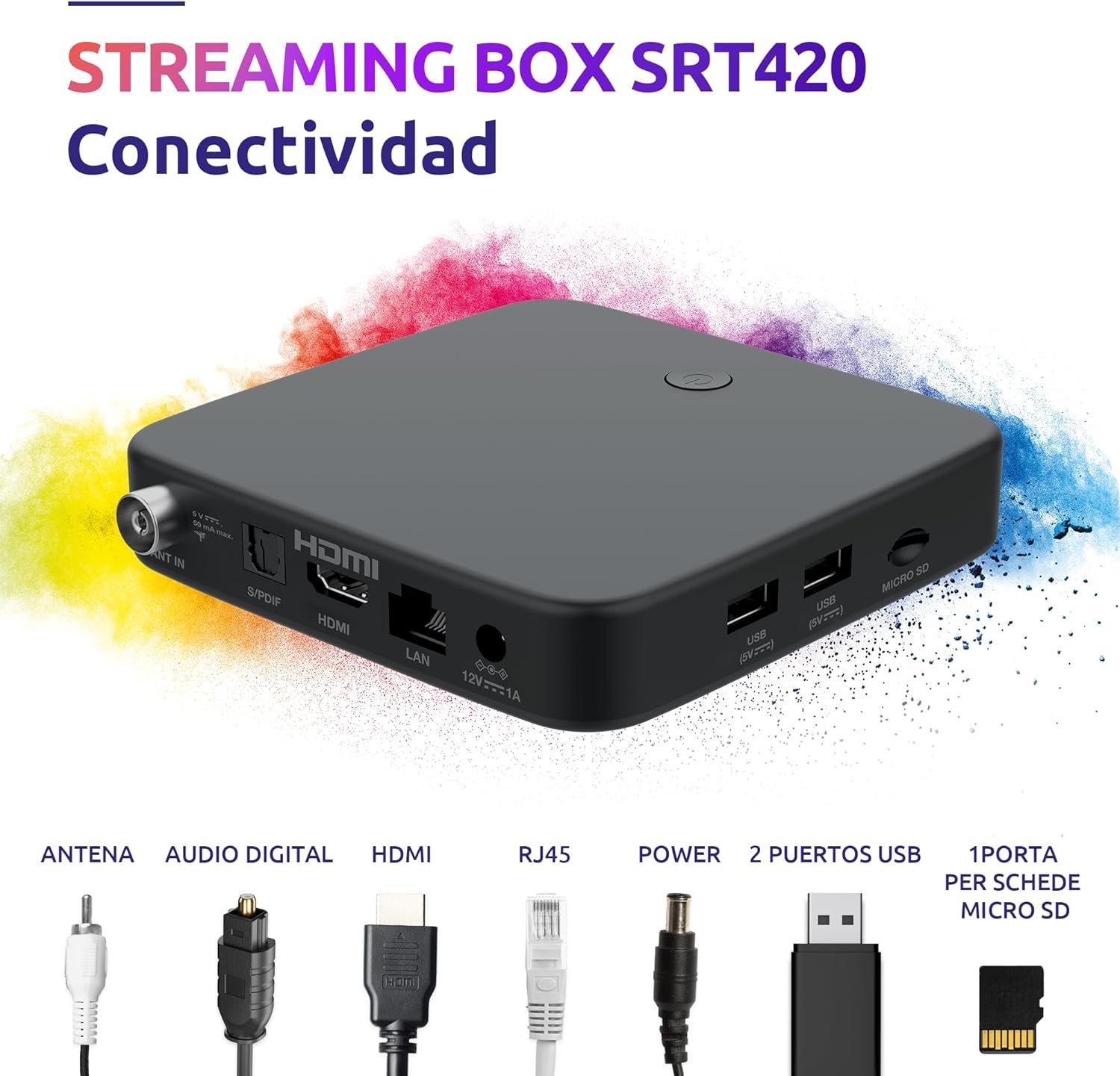 Su televisor se conecta gracias a la caja de transmisión SRT420 Google TV 4K Ultra HD: resolución de hasta 3840 x 2160 píxeles, admite función HDR para una calidad de imagen sorprendente. La última versión de Google TV te brinda una experiencia multimedia intuitiva con una interfaz fácil de usar.