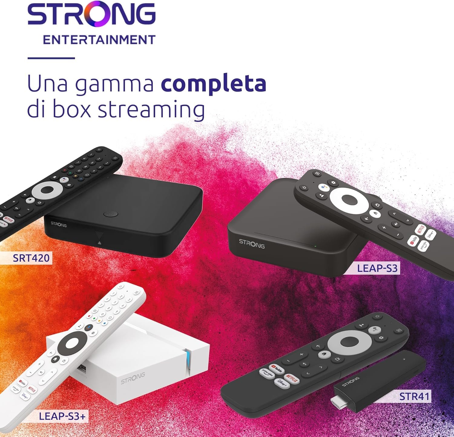 STRONG SRT420 4K Android TV Box con Puerto Ethernet, DVB-T2, 2GB RAM + 16GB Almacenamiento, Chromecast Integrado, WiFi, Google Voice Assistant, HDR10+, Dolby Audio y Dolby Vision