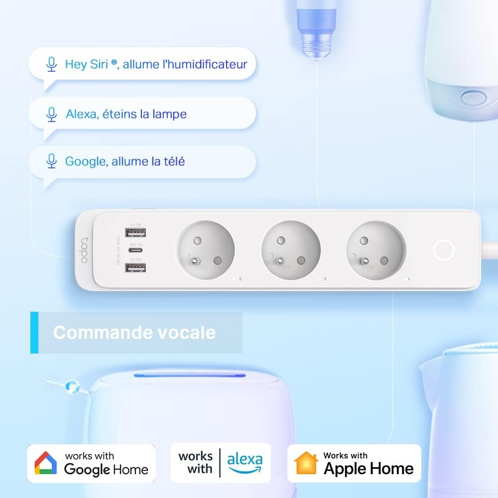 Control individual: controle por separado 3 tomas de corriente inteligentes en la regleta mediante aplicación o comandos de voz