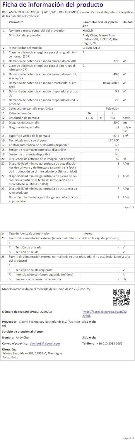 Televisor XIAOMI F 32, 32 Pulgada (81 cm), HD, Smart TV, Fire OS7, Alexa Voice Control, Dolby Audio, DTS Virtual:X, DTS-HD, Compatible con Apple AirPlay, 2025