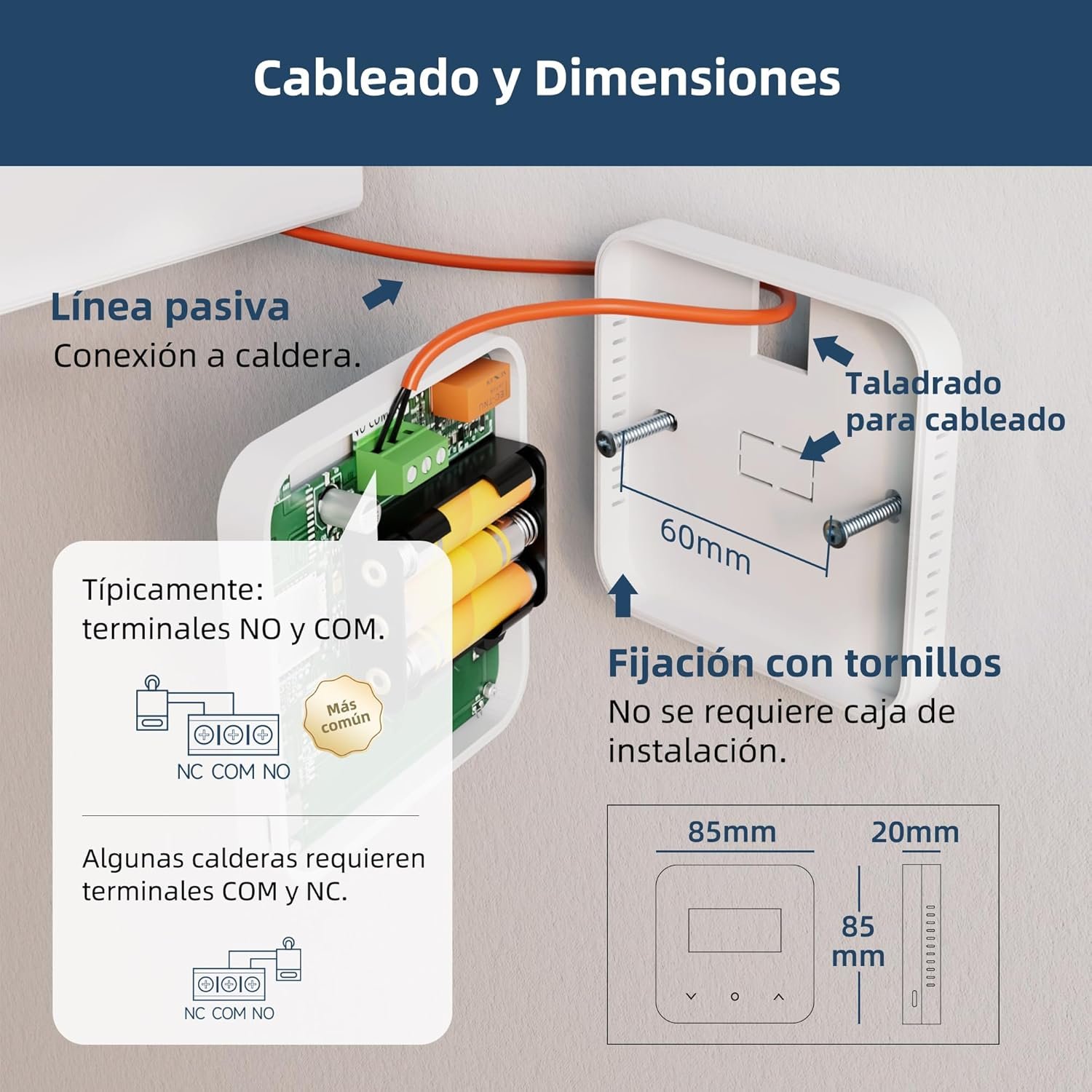 Termostato wifi con batería, apto para calderas de gas de 2 hilos. Termostato programable diario, controlable vía Tuya o Smart Life. Es compatible con el Asistente de Google y Alexa.