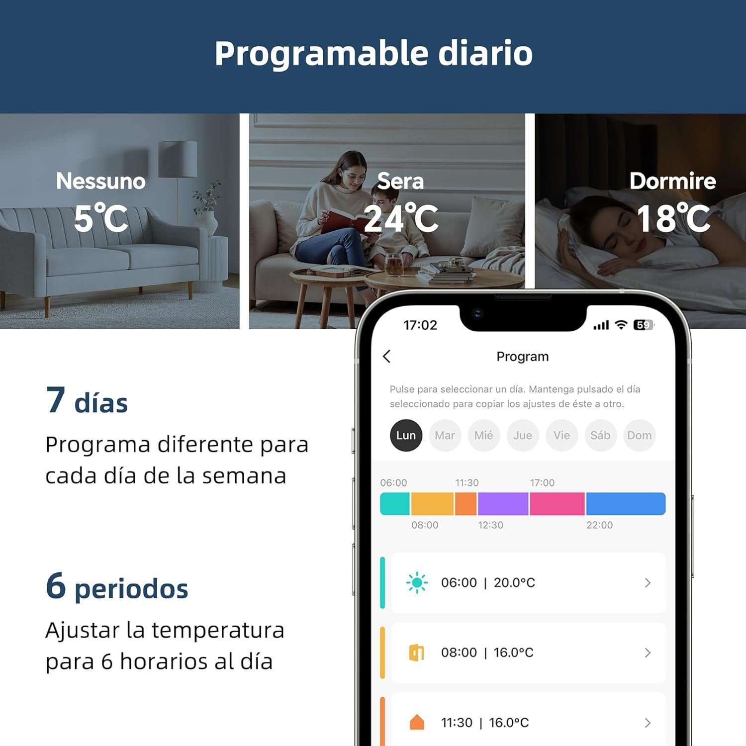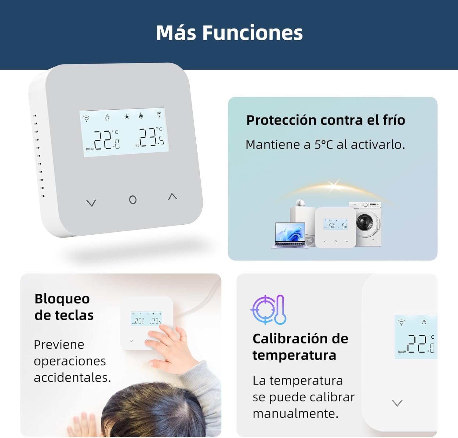 【Termostato WIFI】Este termostato de calefacción funciona con la mayoría de calderas con conexión de contacto SECO para gas o diésel. Verifique el tipo de calefacción de su hogar antes de comprar. El termostato táctil digital solo admite WiFi de 2,4 GHz. 【Control por voz】El termostato es compatible con ALXE y Google Assistant. Podrás encender y apagar el termostato cuando quieras mediante la voz o desde el móvil. Incluso en las noches en las que no hay luces encendidas, podrás preguntarle a Alexa qué temperatura hay en casa o verlo desde tu móvil para saber qué temperatura hay ahora y cambiar la que quieras sin mirar el termostato. 【Programación inteligente】El termostato se puede programar a través de la aplicación TUYA o SAMRT. Gracias al programa de calefacción de 7 días, es posible programar el sistema para que se encienda y regule la temperatura cuando estás en casa y se apague automáticamente cuando sales, según el programa. Se pueden agregar hasta seis eventos por día durante los siete días de la semana. Cada día de la semana se puede programar de forma independiente. 【Compartir dispositivo】Es posible compartir la gestión del dispositivo con otras personas, por ejemplo, con familiares, a través de la aplicación. Esto permite cubrir las diferentes necesidades de cada miembro de la familia en cuanto a temperatura ambiente. 【ESPECIFICACIÓN DEL TERMOSTATO】 Con un rango de temperatura ajustable de 5 °C a 60 °C, este termostato temporizador inteligente para caldera ofrece funciones confiables que le encantarán: selección de modo de calefacción/refrigeración, calibración de temperatura, función de reinicio, etc. Si no desea que otras personas modifiquen la configuración de la pantalla, puede bloquear el termostato.
