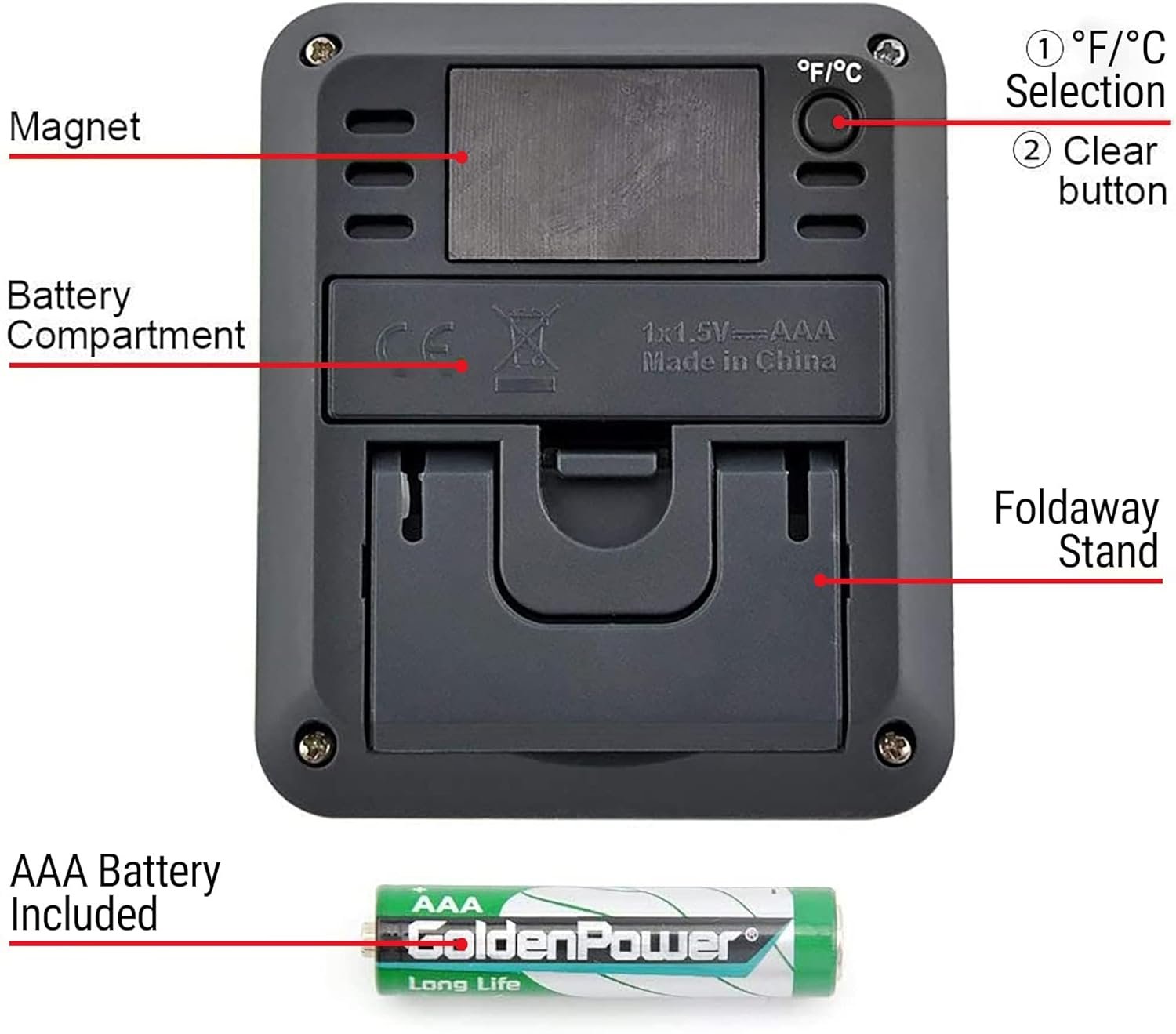 Diseño inteligente: el termómetro interior cuenta con un soporte de mesa para colocar el monitor de temperatura en el mostrador o utilizar el respaldo magnético para conectarlo a un refrigerador; selector °F / °C; Alimentado por 1 pila AAA (incluida)