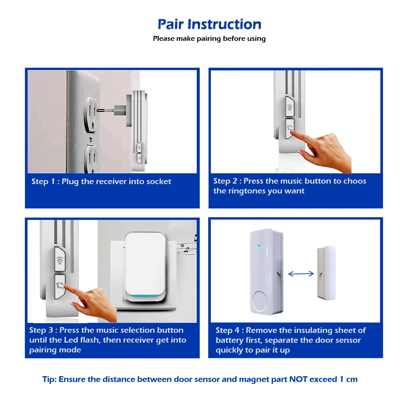 Producto: Emisor y receptor de timbre inalámbrico sin timbre estándar. Fácil de usar e instalar, sin costes de decoración. Ideal para viviendas, villas, fábricas, hoteles, casas de té y oficinas. Características: ASK Tecnología súper heterodina para evitar interferencias. Alcance del control remoto de hasta 280 metros en área abierta. Bajo consumo de energía, la batería del transmisor dura hasta 1 año. Especificaciones del transmisor: DC CR2032x1, frecuencia 433,92 MHz, potencia de transmisión 510 mW, temperatura de trabajo -10 ℃ a 60 ℃. Especificaciones del receptor: CA 90-240 V 50/60 Hz, frecuencia 433,92 MHz, consumo de energía de 0,5 W, temperatura de trabajo de -10 ℃ a 60 ℃, tono de timbre ajustable.