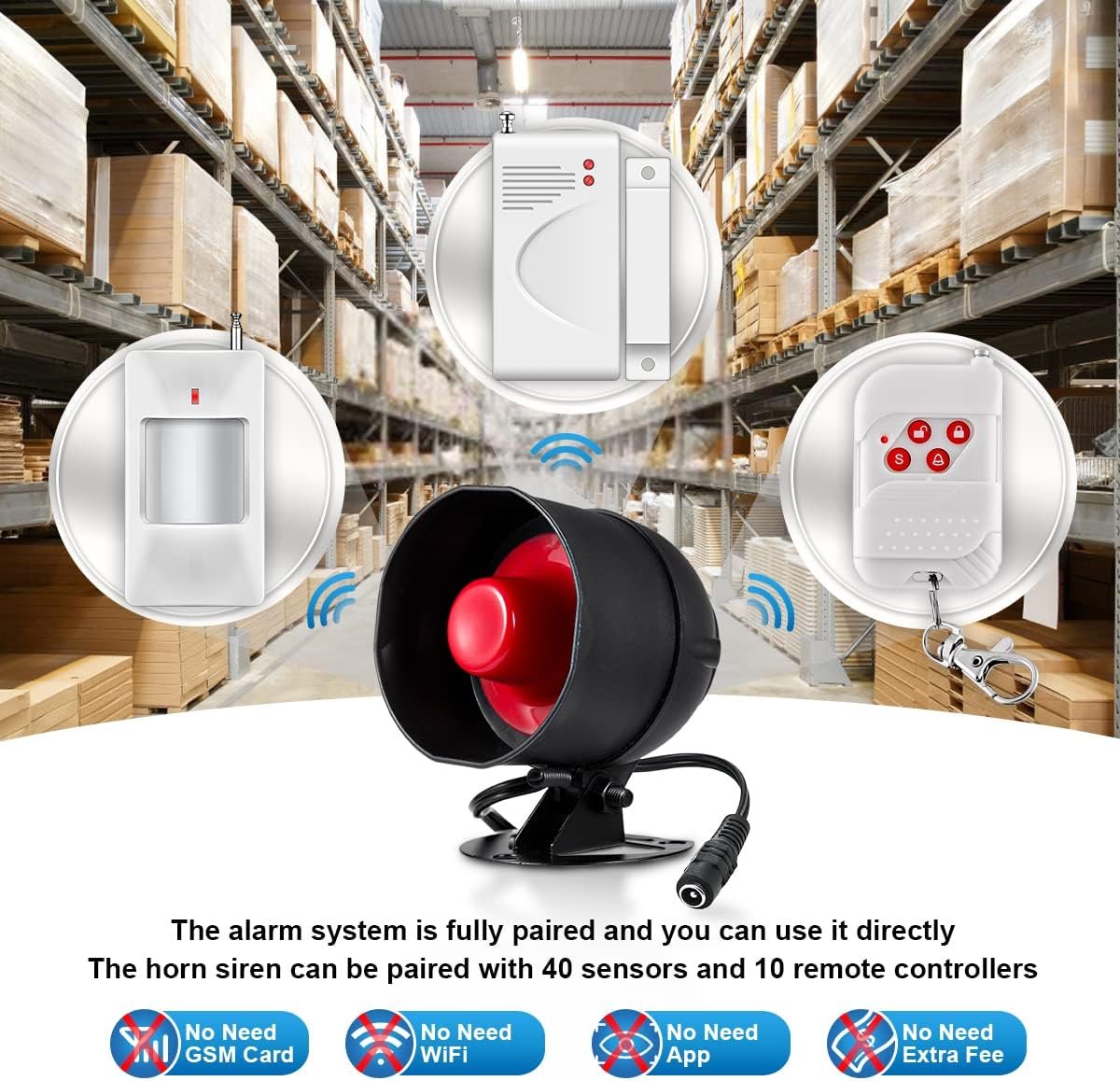 SISTEMA DE ALARMA COMPLETO: este sistema de alarma para el hogar incluye 1 sirena con salida, 3 sensores de alarma de puerta, 2 detectores de movimiento y 2 controles remotos. No necesitan conexión a la red ni descargar ninguna aplicación; usted puede crear fácilmente un sistema de seguridad completo para proteger su hogar o su familia.