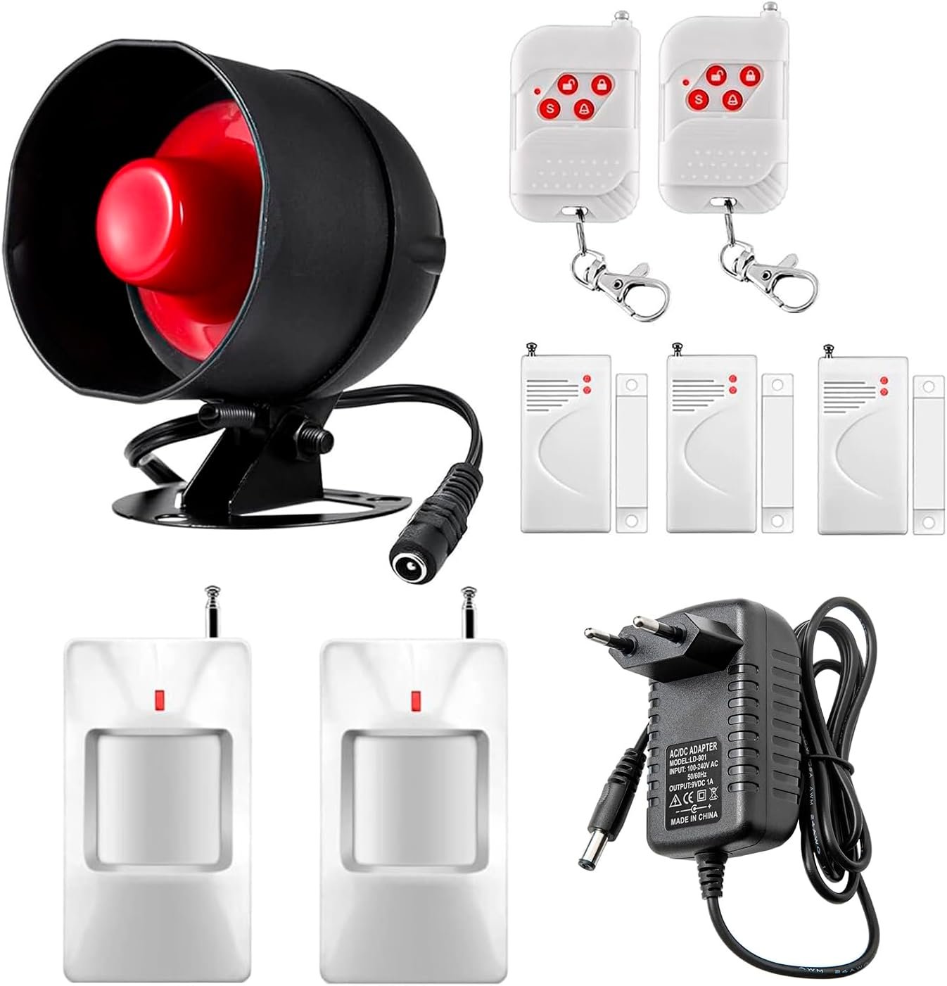 1 bocina de sirena, 3 sensores de alarma para ventanas inalámbricas, 2 detectores de movimiento infrarrojos, 2 mandos a distancia y 1 toma de corrienteEsta es una manera fácil y rápida de construir un sistema de seguridad para proteger tu almacén/garaje/casa.Alarma alto decibelios (115dB) durante 2 minutos para disuadir a los intrusos. El sistema de alarma admite hasta 40 sensores inalámbricos y 10 sensores inalámbricos y 10 Mando a distancia.