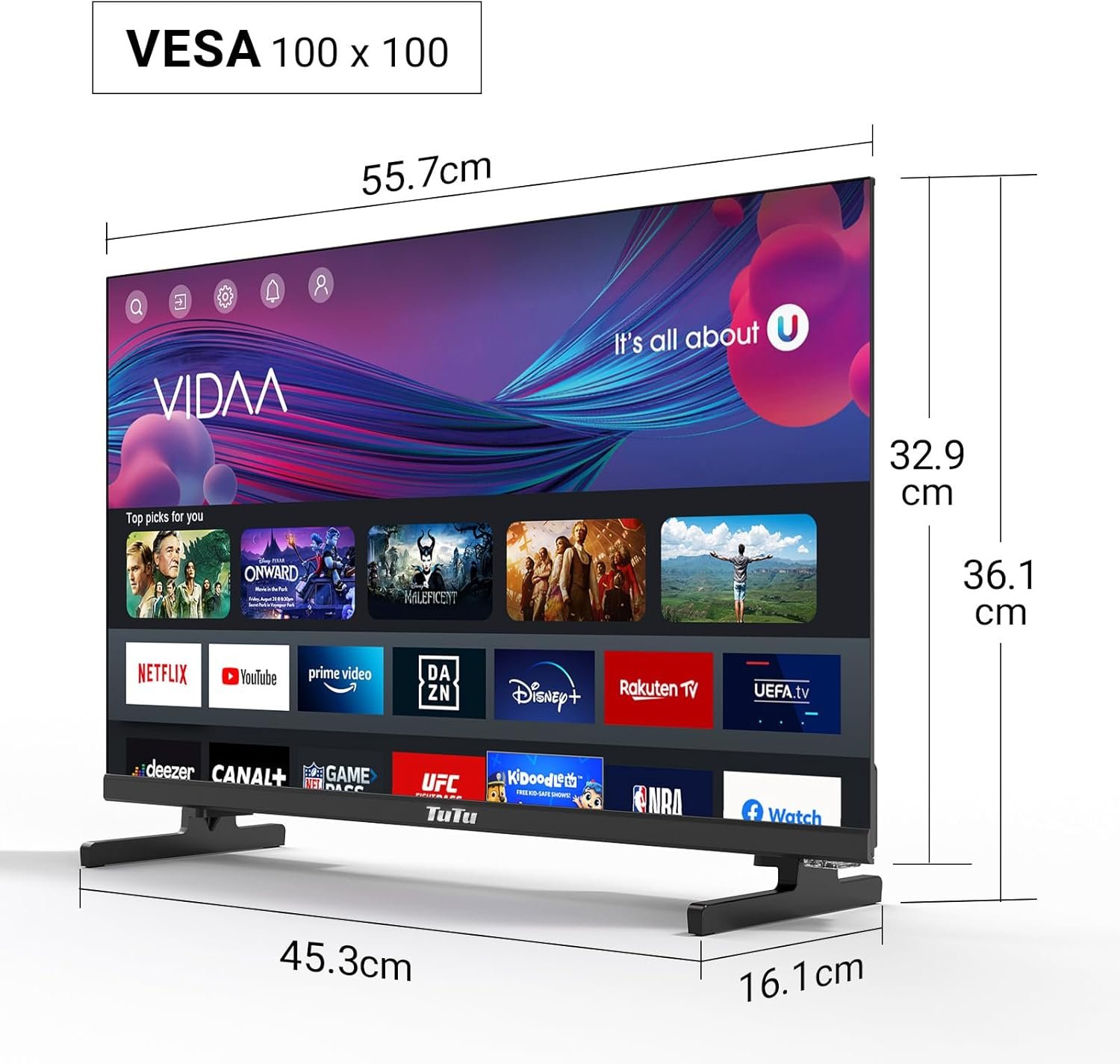 TuTu Smart TV Televisor WiFi FHD de 25 pulgadas con pantalla LED, WLAN, App Store, Sintonizador digital, Prime Video, Netflix, Youtube, DAZN, Disney+, Pluto TV y más (TUV25FQ1B, 2024)