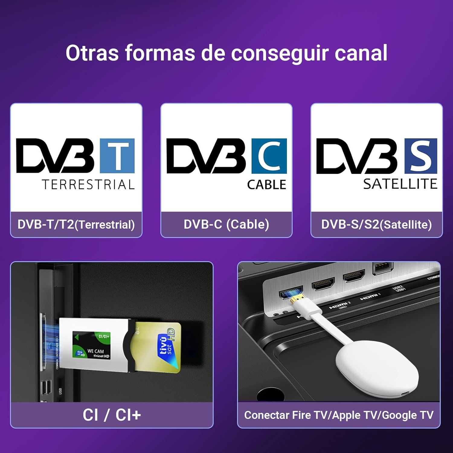【Otra manera】Si no tienes wifi, puedes obtener el canal a través de: (1). Conecte Ethernet para convertirse en un televisor inteligente; (2). cable (DVB-C), satélite (DVB-S/S2) o antena (DVB-T/T2). (3). Ranura IC (CI+) con módulo de TV HD+; (4). Conecte una TV Box como Fire TV, Apple TV, Google TV y más.
