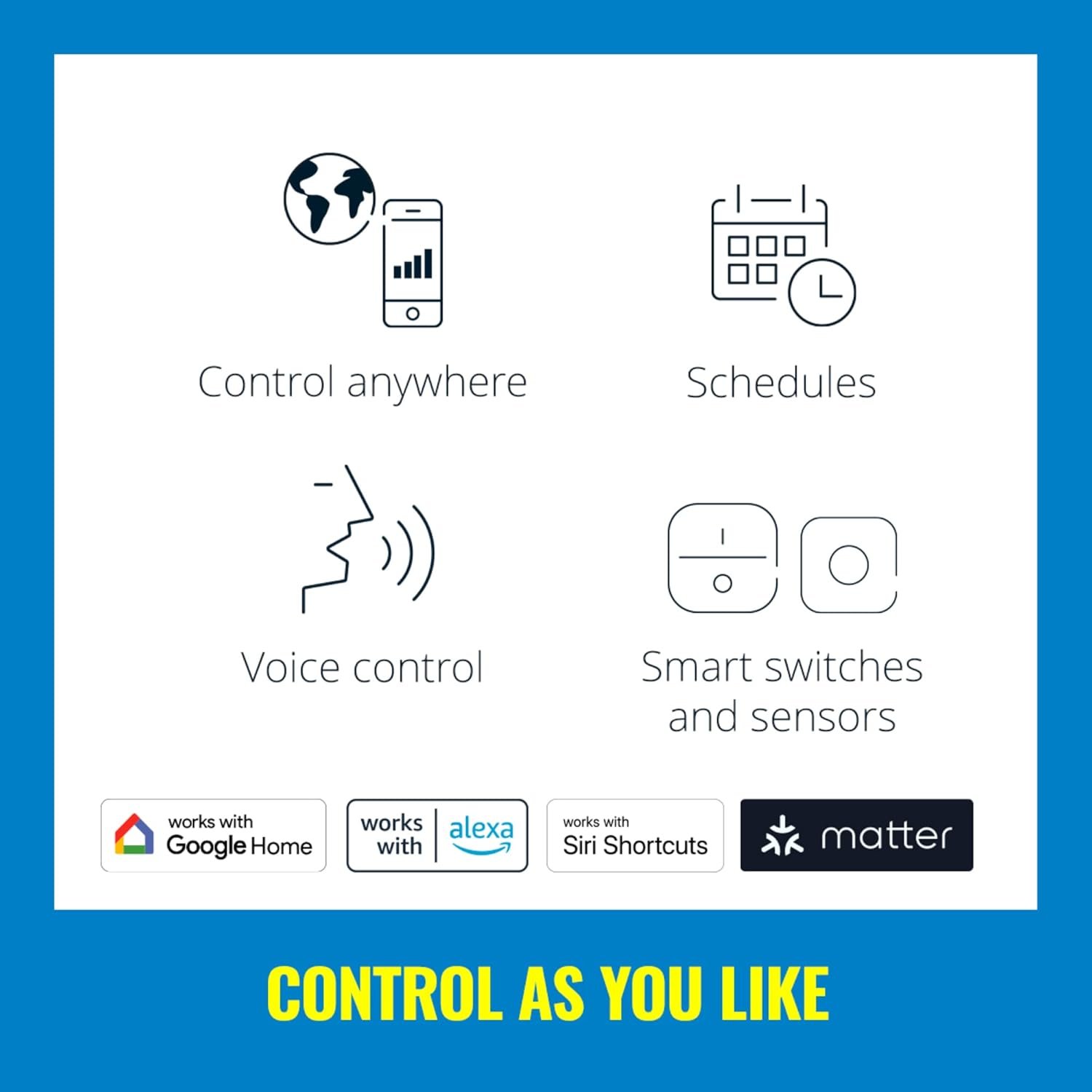 Control de voz con los atajos del Asistente de Google, Alexa o Siri: obtenga control de sus luces con manos libres y use los atajos de voz y del Asistente de Google, Amazon Alexa o Siri. Utilice comandos de voz sencillos para encender o apagar las luces, intensificar o regular su brillo, cambiar colores y configurar escenas de iluminación personalizadas.